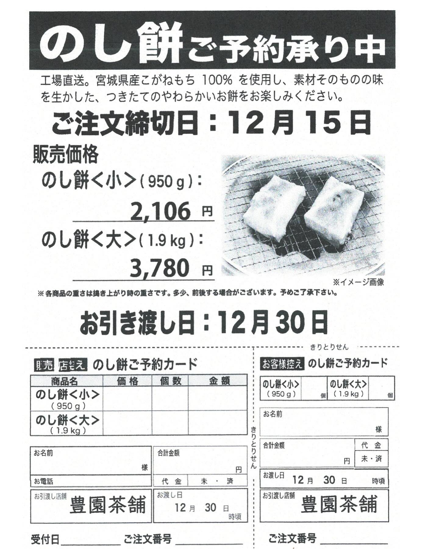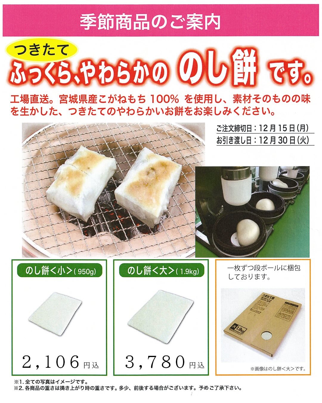 ご予約は12月15日まで お渡しは12月30日一日限り。やーわらかい、つき立てで届きますので、その日のうちに切り分けてください。