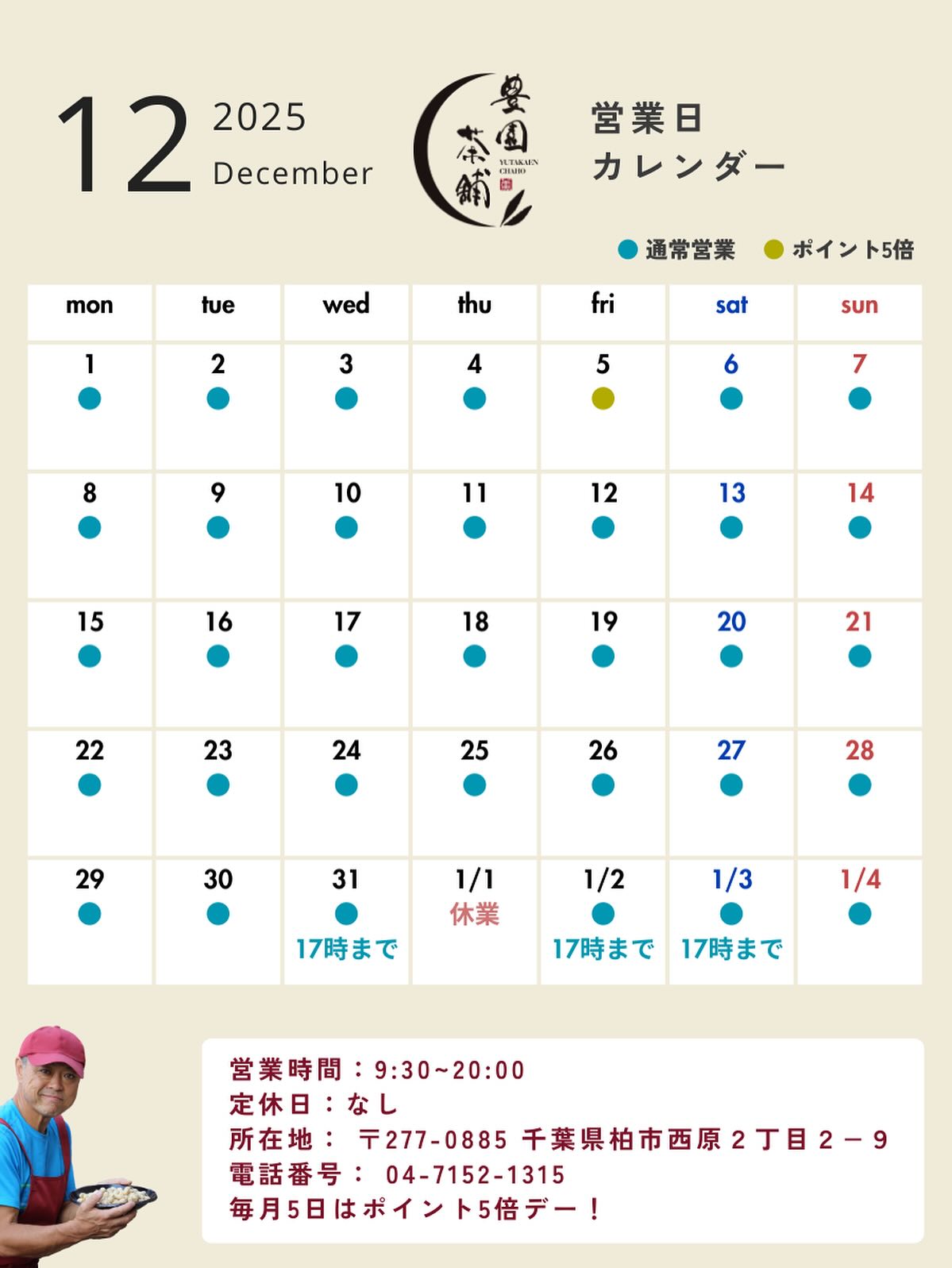 年内は無休です。(年末年始の営業時間は異なります。)